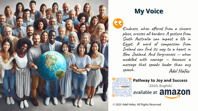 “Kindness, when offered from a sincere place, crosses all borders. A gesture from South Australia can impact a life in Egypt. A word of compassion from Ireland can find its way to a heart in New Zealand. And forgiveness — when modelled with courage — becomes a message that speaks louder than any speech.” — Adel Hafez, Chapter 16: Forgiveness Is Freedom, Pathway to Joy and Success: A journey of the heart... where joy awakens, and success finds its soul.