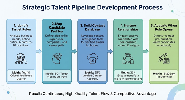 Forward-thinking talent acquisition teams have rejected the reactive model entirely. Instead, they're building continuous talent pipelines for critical roles, identifying high-potential candidates long before positions open.