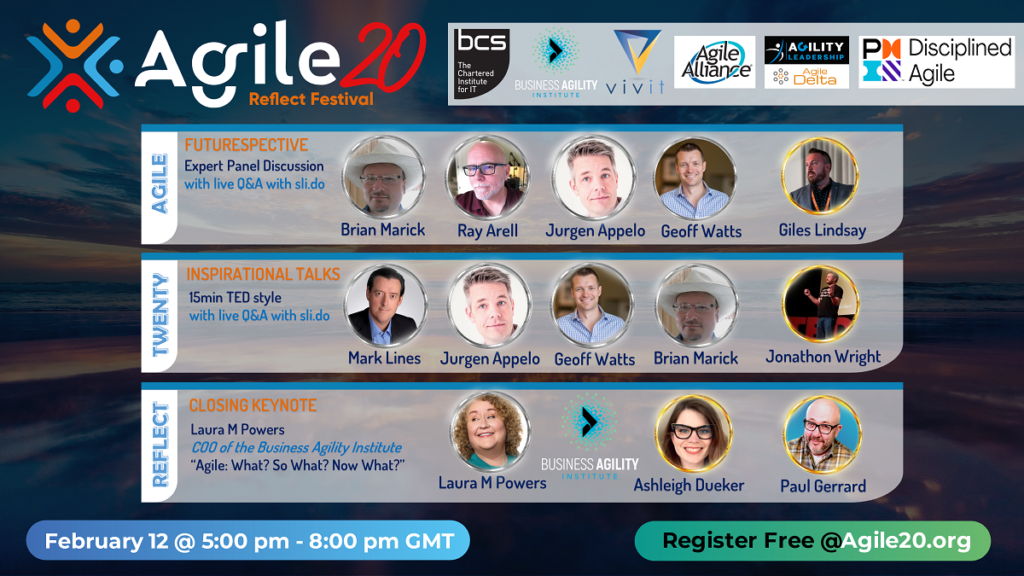 Location: North America Date : February 17, 2021 - February 17, 2021 Organizer: Agile20Reflect Festival | Karl Smith CTO and Trustee