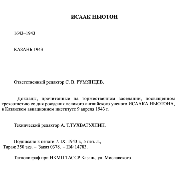 This 1943 volume was published in Kazan to commemorate the 300th anniversary of Isaac Newton’s birth (1643–1943). It collects scholarly papers presented at the Kazan Aviation Institute, covering Newton’s life and career, his portraits and iconography, his major contributions to optics, and his philosophical ideas. The book is supplemented with reproductions of portraits of Newton and his contemporaries.