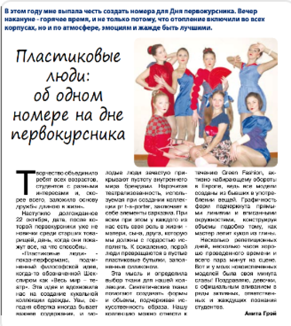 At KNITU’s Freshman’s Day, students presented the performance “Plastic People,” a fashion show inspired by Shakespeare’s idea that “all the world’s a stage.” The collection, made from recycled materials, highlighted themes of artificiality and consumerism while supporting the Green Fashion movement. After weeks of rehearsals, the student models proudly showcased their creativity and responsibility on stage.