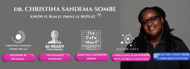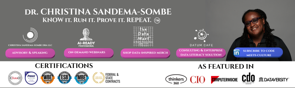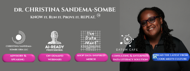 In Season 3, Episode 8, we speak with Christina Sandema-Sombe, CEO Christina Sandema-Sombe DBA LLC and Co-Founder & CDAIO Datum Cafe, about her aptitude for science in Zambia & focus to becoming a doctor but with the help of mentors altering her career path to becoming a leader of not one but two data centered companies.