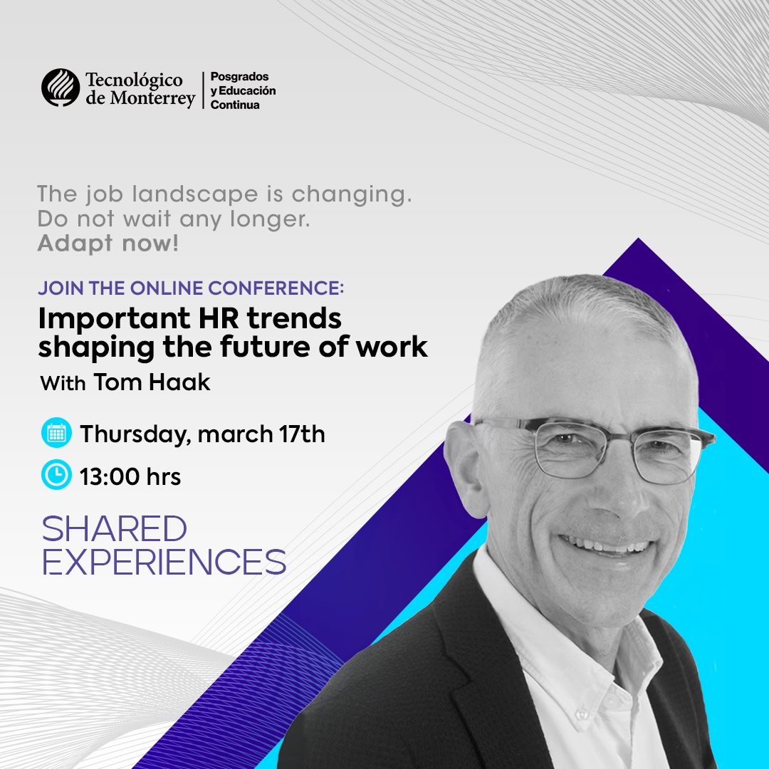 Conoce más sobre esto asistiendo a la conferencia en línea “Important HR trends shaping the future of work”, que ofrecerá Tom Haak, director del HR Trend Institute, uno de los principales líderes en la materia y profesor invitado distinguido del Tecnológico de Monterrey.