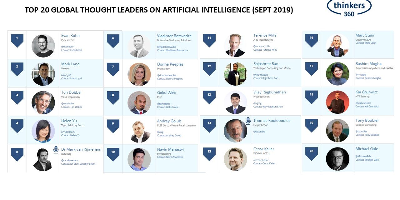 Here’s the Thinkers360 leaderboard for the top 20 global thought leaders and influencers on Artificial Intelligence for September 2019. Congratulations to all our thought leaders and experts who participated!